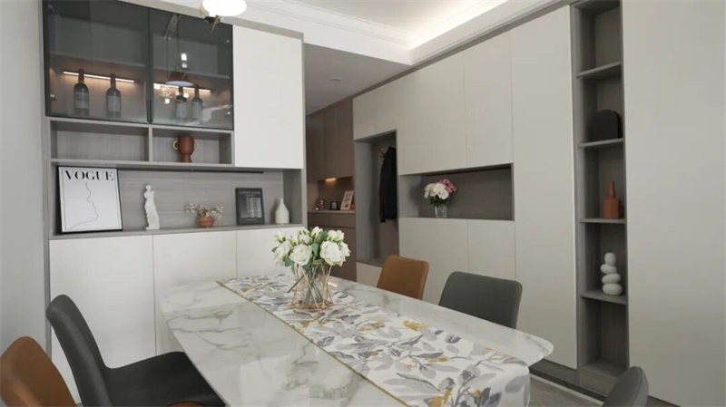 餐厅以极简线条勾勒出优雅的用餐氛围,大理石纹理餐桌搭配柔和色调的餐椅,营造出轻盈而高级的空间质感。背景墙定制收纳柜采用无把手设计,整体简洁利落,兼具美观与实用功能——玻璃门酒柜内嵌灯带,低调展示收藏美酒,增添生活仪式感。开放式置物格点缀艺术摆件与绿植,让细节充满温度。